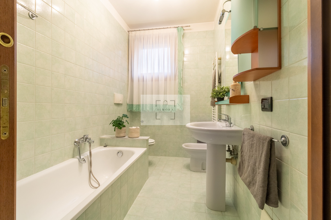 Un bagno funzionale con vasca e un disimpegno con armadio a muro che funge da ripostiglio.